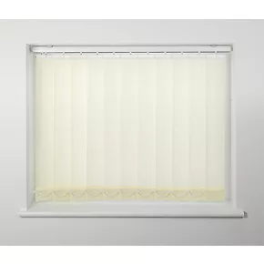 Cordless vertical blind. Operated using a wand which can be used to open, close and adjust the vanes. Width and drop can also be reduced by the installer.