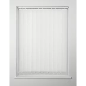 Cordless vertical blind. Operated using a wand which can be used to open, close and adjust the vanes. Width and drop can also be reduced by the installer.